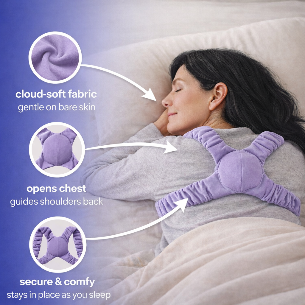 As you sleep, gravity gently opens your chest and guides your shoulders back for a sustained 6–8 hour passive stretch.