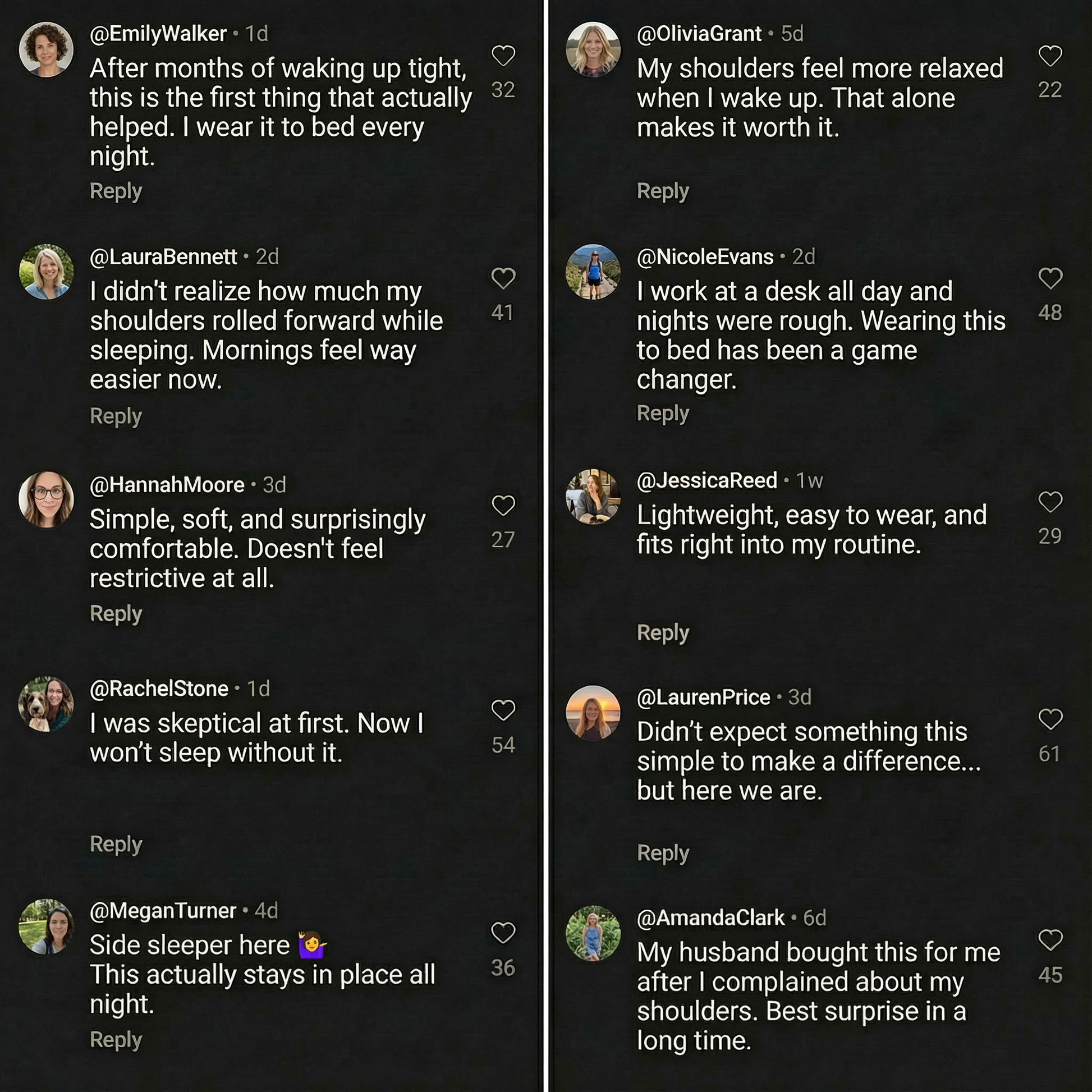 DEC 2025MMia K.Verified BuyerNo Daytime Effort NeededI love that I don’t have to remind myself about posture during the day. I just put it on before bed.